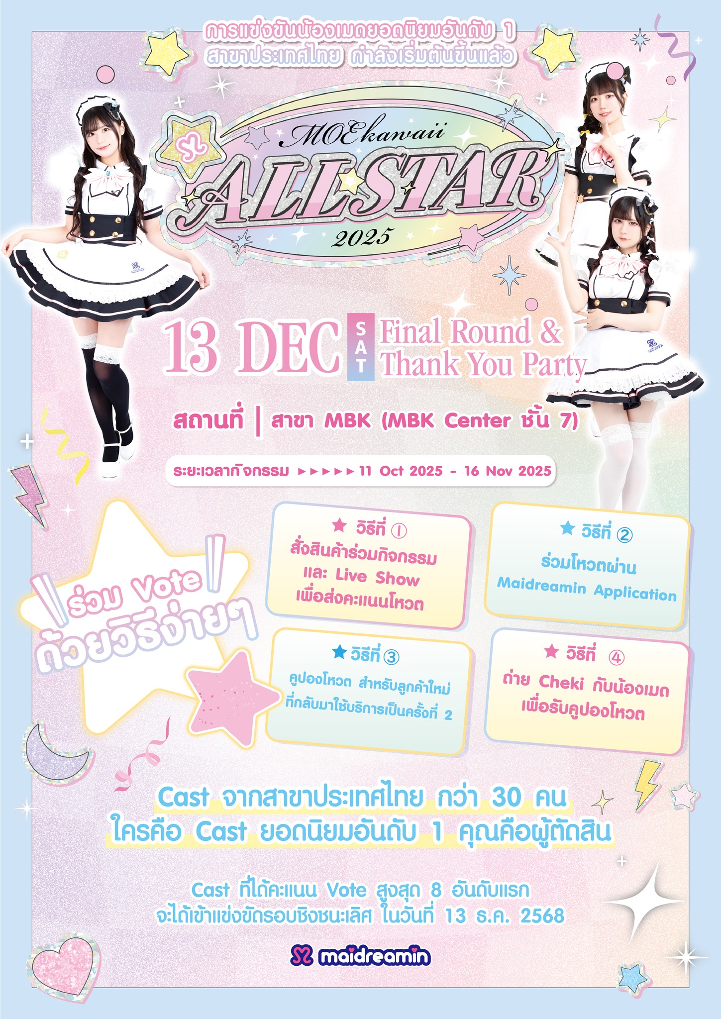 ปิ๊งป่อง📣 กิจกรรมคัดเลือกน้องเมดยอดนิยมอันดับ 1 ประจำปี 2025 กำลังจะกลับมาอีกครั้ง~ 🎉🥳 เตรียมพบกับ MOEkawaii ALL☆STAR 2025 ในวันที่ 11 ต.ค. 2568 นี้!! มาร่วมโหวตเป็นกำลังใจให้น้องเมดที่ทุกท่านประทับใจ เพื่อค้นหาน้องเมดอันดับ 1 ของสาขาประเทศไทยกันนะคะ