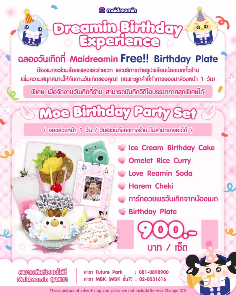 ฉลองวันเกิดที่ Maidreamin Cafe รับฟรี!! Birthday Plate น้องจะร่วมร้องเพลงและอวยพร และยังได้รับบริการถ่ายรูปพร้อมกับน้องเมดทั้งร้าน!