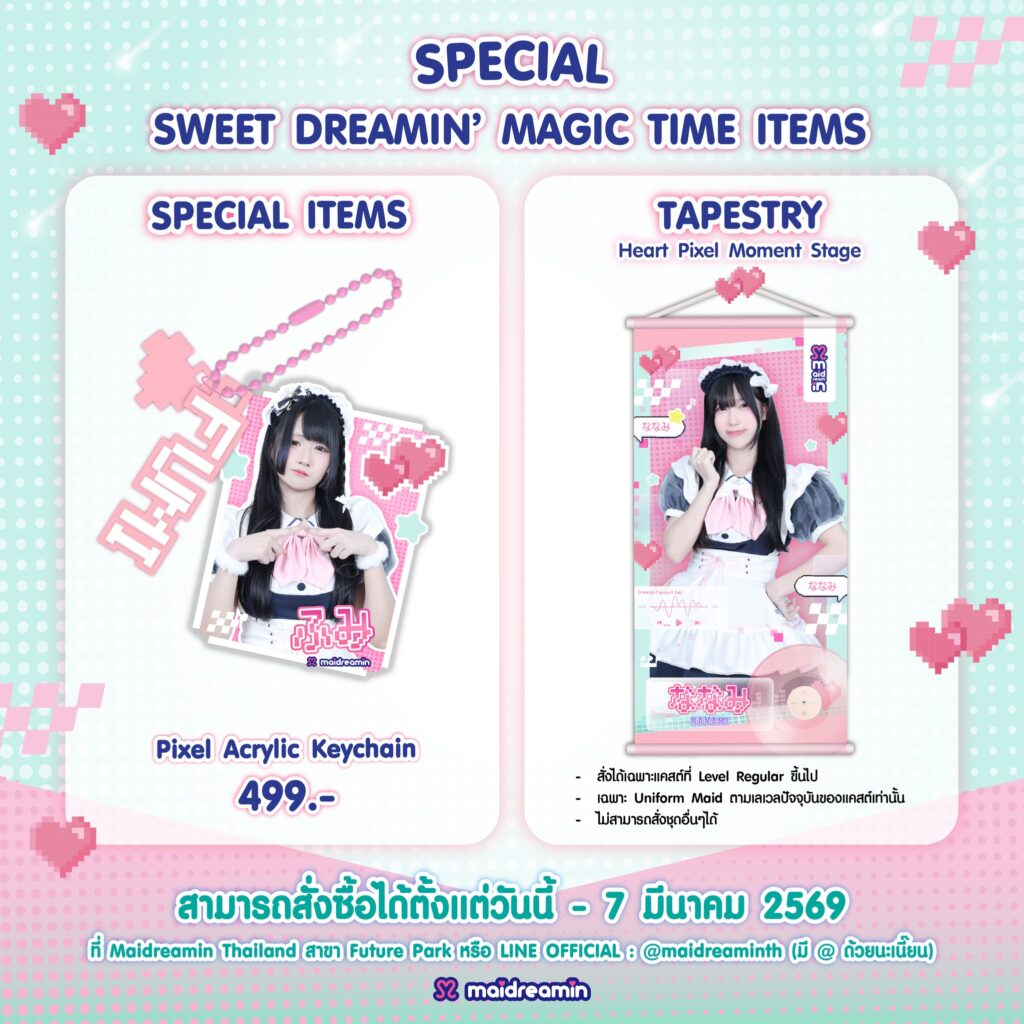 หากสั่งซื้อและชำระเงินภายในวันที่ 3 มีนาคม 2569 รับฟรี! พวงกุญแจ Key Holder และจะได้รับสินค้า ภายในวันงาน 7 มีนาคม 2569 ที่ Maidreamin Future Park